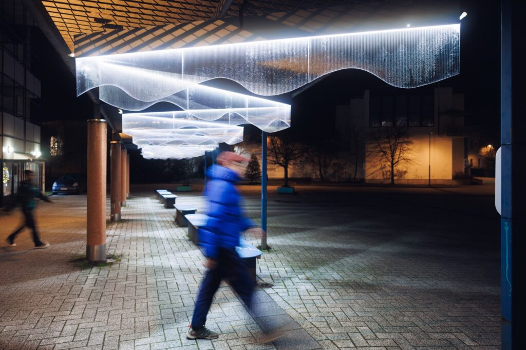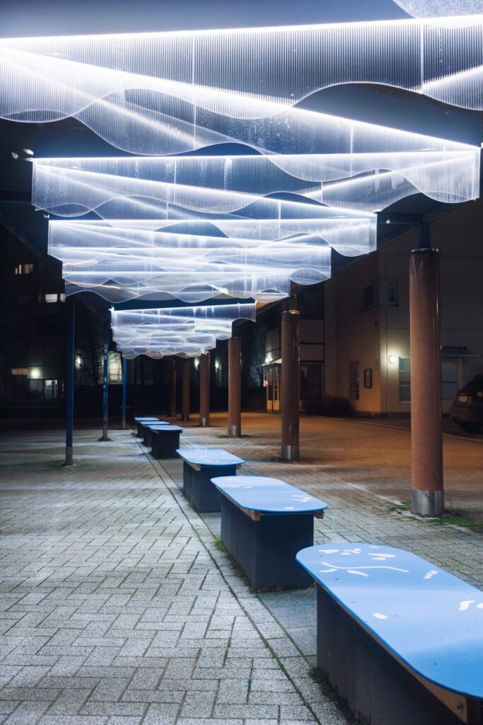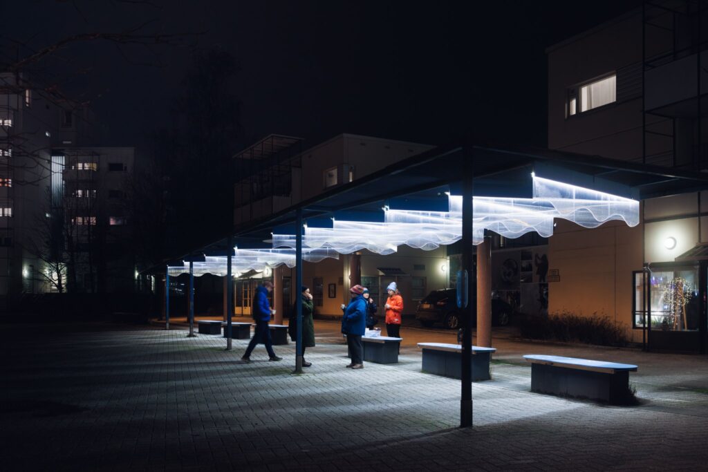 Talvisesta säästä ja merestä – tuulesta ja aalloista – inspiraationsa saanut installaatio herättää aukion katoksen eloon taiteellisella valaistuksella, jossa valo, varjot ja muodot ovat vuorovaikutuksessa keskenään. Kylmät kivipenkit on päällystetty puuelementeillä, mikä tekee aukiosta mukavamman talvikäyttöön.